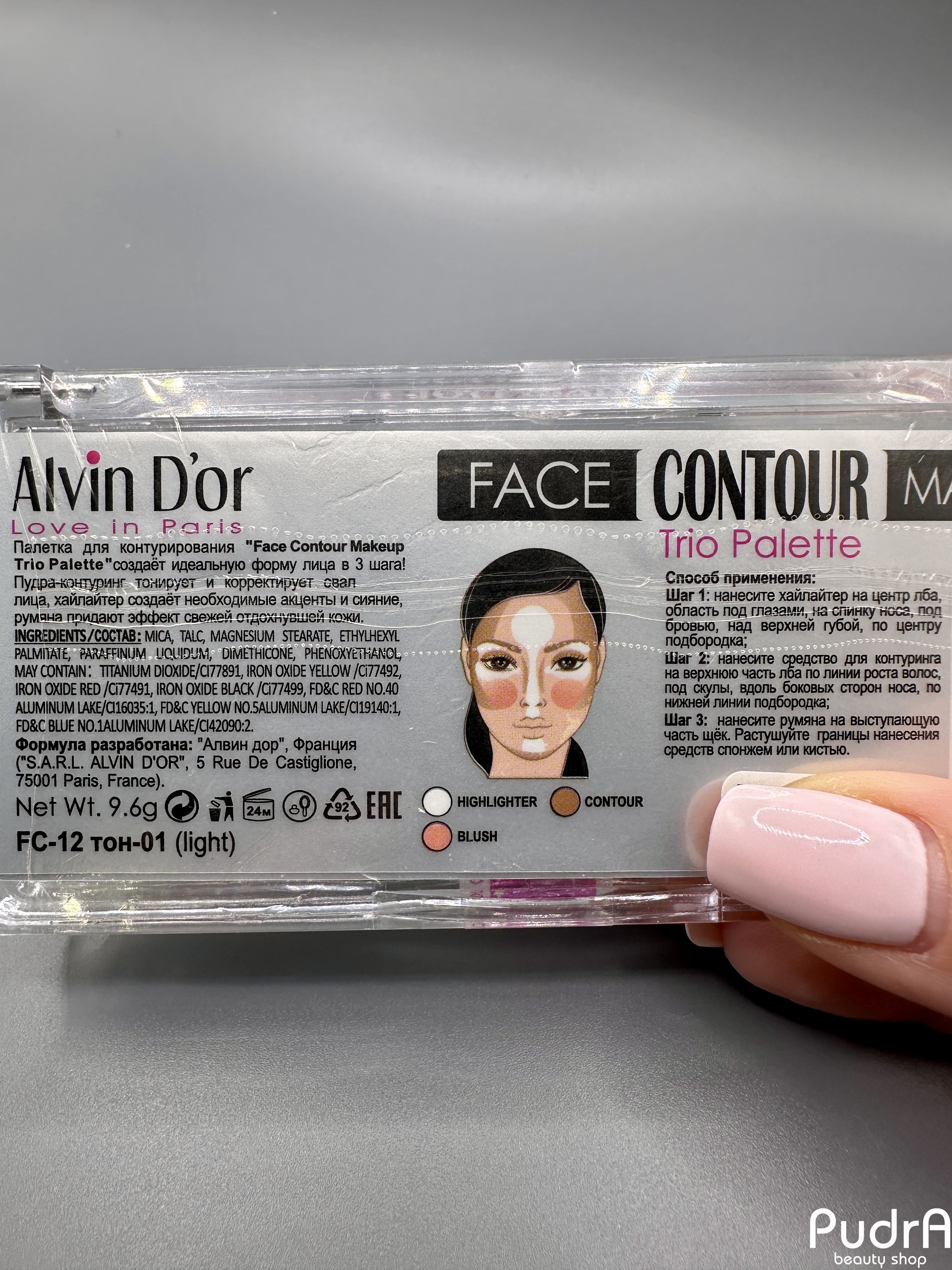 Cпособ нанесения: Шаг 1: нанесите хайлайтер на центр лба, область под глазами, на спинку носа, под бровью над верхней губой, по центру подбородка. Шаг 2: нанесите средство для контуринга на верхнюю часть лба по линии роста волос, под скулы, вдоль боковых сторон носа, по нижней линии подбородка; Шаг 3: нанесите румяна на выступающую часть щёк. Растушуйте границы нанесения средств спонжем или кистью.