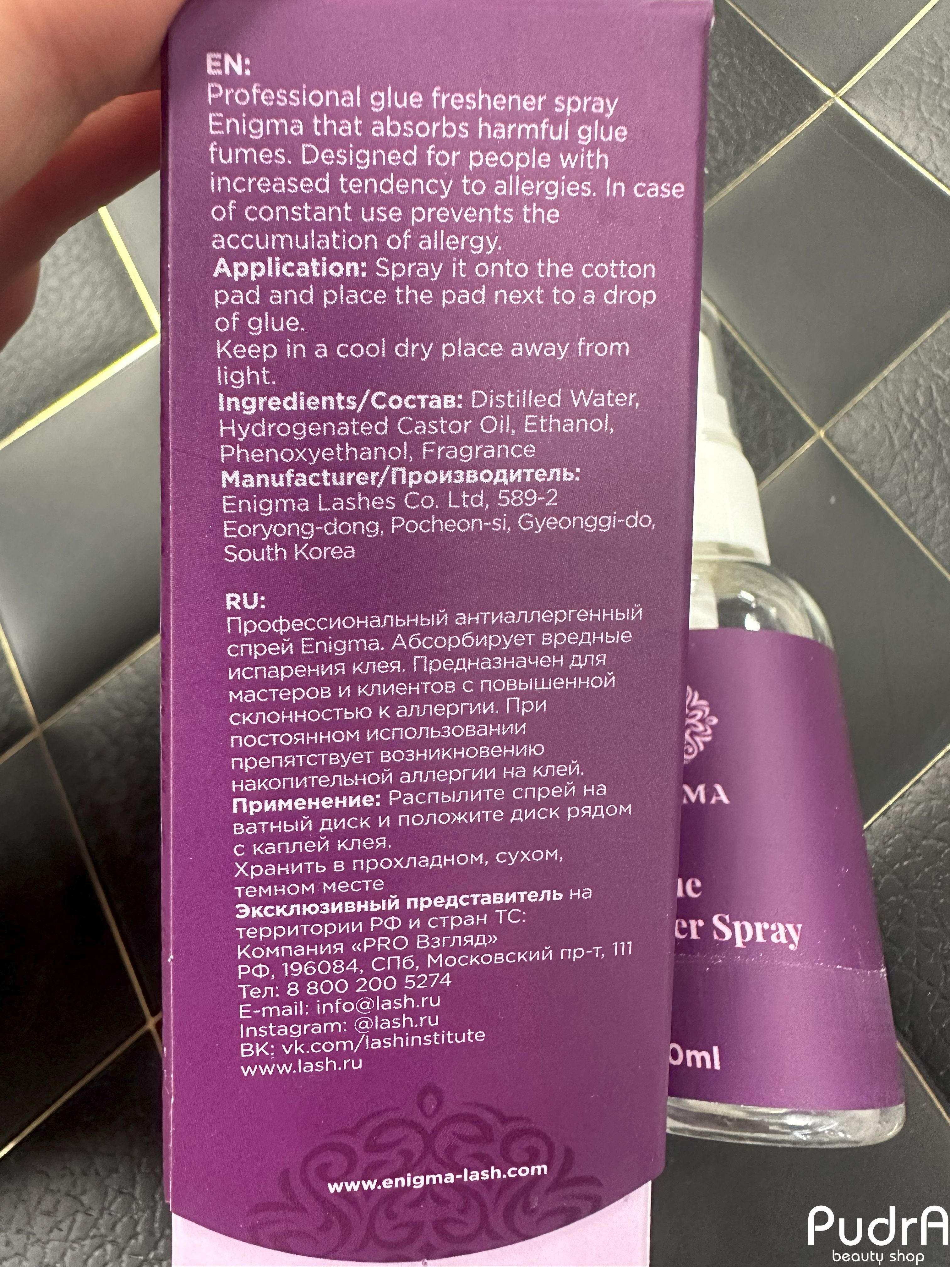 Профессиональное антиаллергенное средство в форме спрея ENIGMA: абсорбирует вредные испарения клея для наращивания ресниц, снижая неприятные ощущения у чувствительных мастеров и клиентов.