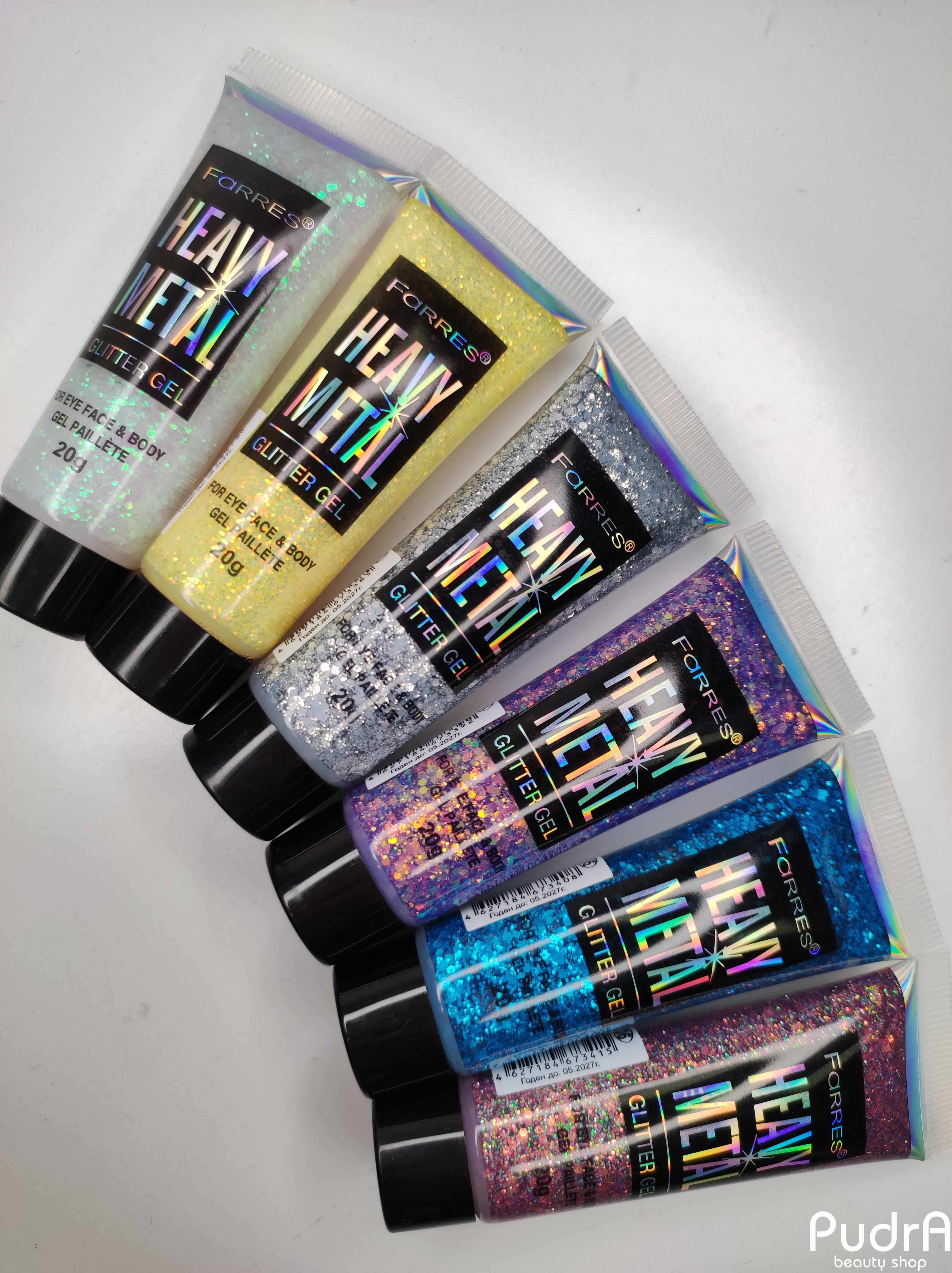 Глиттер-гель - это праздничная феерия, которая позволит сиять на любой вечеринке. Любой праздник засияет на твоем лице и теле. Супер блестящие блестки можно наносить на лицо, тело и даже прическу. Тренд в декоративной косметике. Блестки (глиттер-гель) Фаррес для лица, волос и тела. Тонкие косметические блестки Farres на гелевой основе. Мелко нарубленные частички на коже заметны невооруженным глазом и их главная задача в макияже - придать блеск и сияние. Глиттер-гель для лица и тела Farres Heavy Metal обладает легкой гелевой текстурой, которая не оставляет чувства липкости или неприятных ощущений.Наносить можно кистью для макияжа или пальцами.Супер сияющие блестки можно наносить на глаза, лицо, тело и даже волосы.Блестки в Heavy Metal светоотражающие, благодаря чему обеспечивается яркое сияние.Благодаря водной основе глиттер-геля, смыть его с тела и лица легко обычной водой.Быстро высыхает после нанесения.Эффект от применения длится до 9 часов.Удивите всех своим новым образом.
