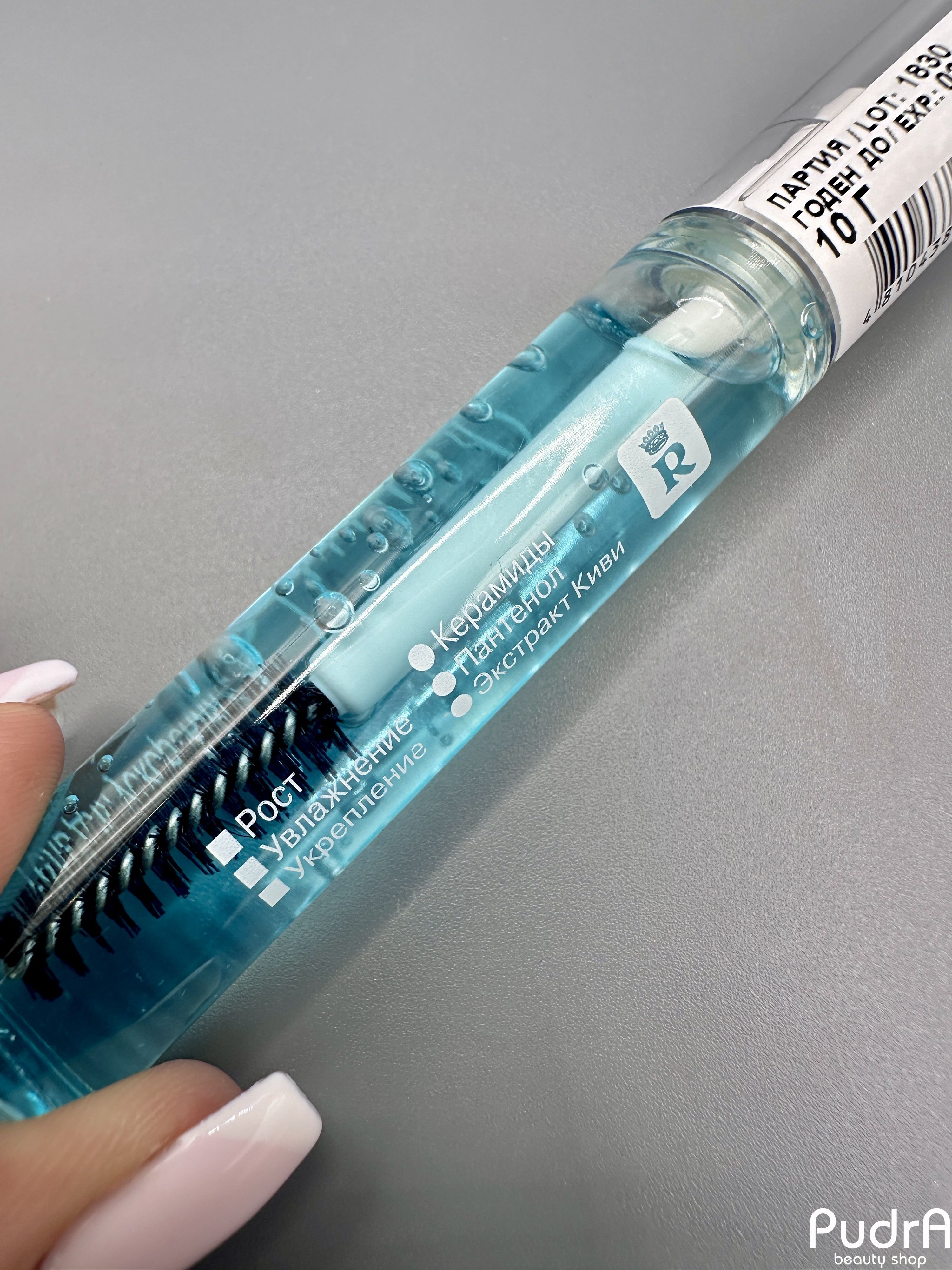 В состав геля входят вода киви, пантенол и керамиды – активные увлажняющие компоненты, которые питают ресницы изнутри, облегчая и ускоряя их рост. Вода киви и керамиды обеспечивает постоянное увлажнение, предотвращая потерю влаги и придавая ресницам здоровый вид. Пантенол защищает структуру ресниц, улучшает их блеск и гибкость, делает ресницы более устойчивыми к негативному воздействию окружающей среды.