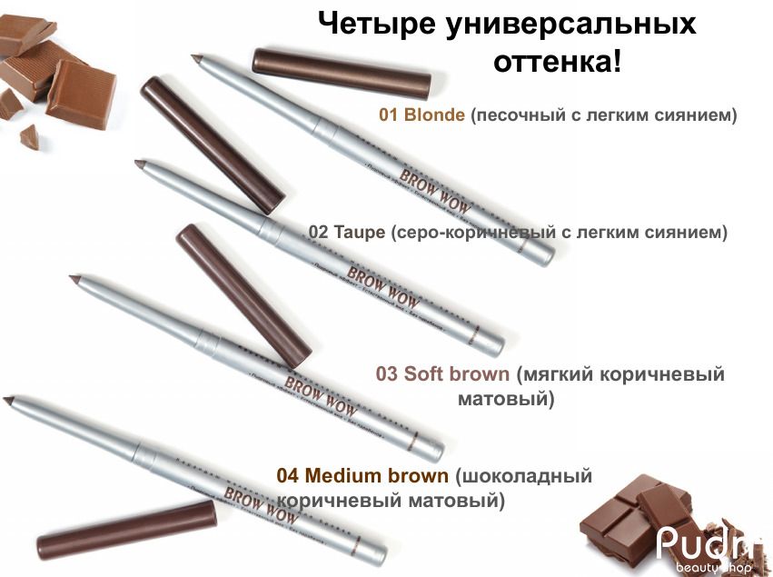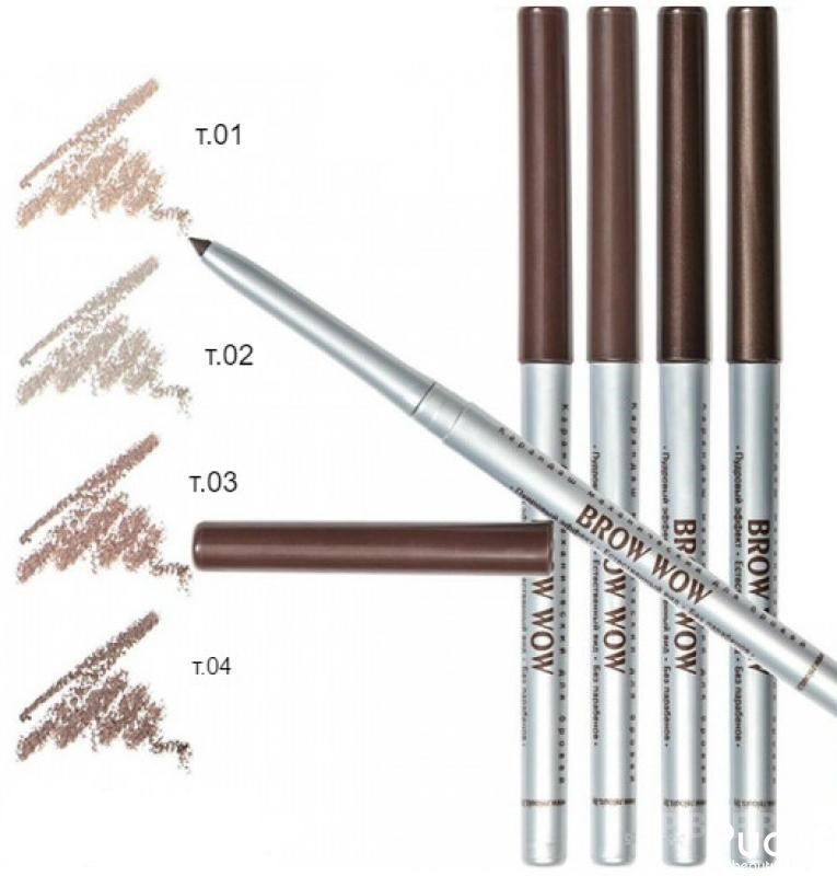 Пудровый механический карандаш для бровей "BROW WOW", особая пудровая текстура не требует дополнительной растушевки, легко наносится и держится в течение всего дня, обеспечивает эффект естественных натуральных бровей, выразительных и ухоженных, обеспечивает насыщенность и однородность цвета, не нужно затачивать.
