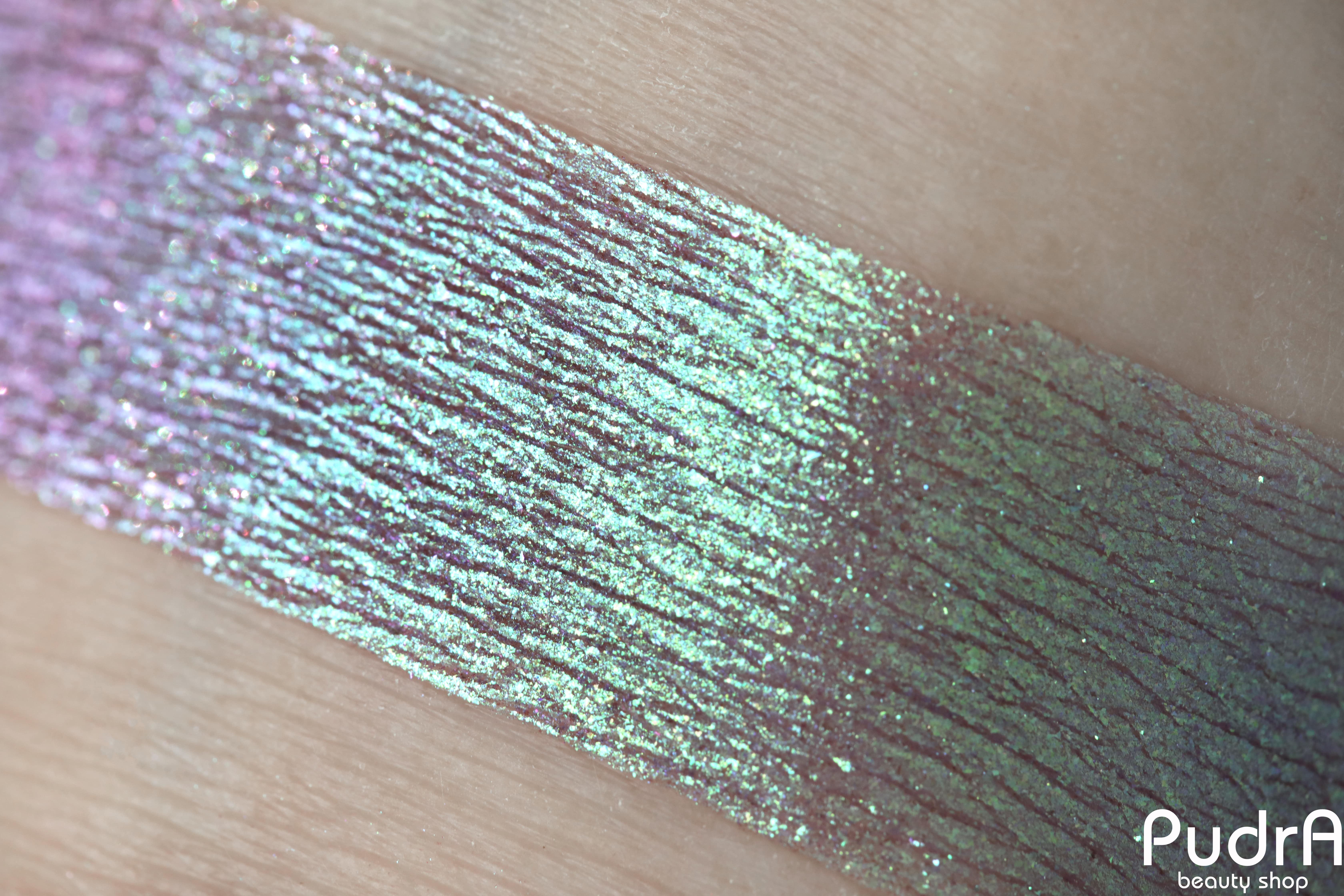 Цвет: продолжение фиолетовой темы. Влажный эффект с переливом от бирюзы к сиреневому. Близок к оттенку Маленькая Злая Девочка, но в форме шиммера. Для максимального эффекта требует набивки на липкую подложку либо влажный способ. Сложность - легко/средне. Прозрачность - высокая/средняя. Назначение - акцентный, топпер.