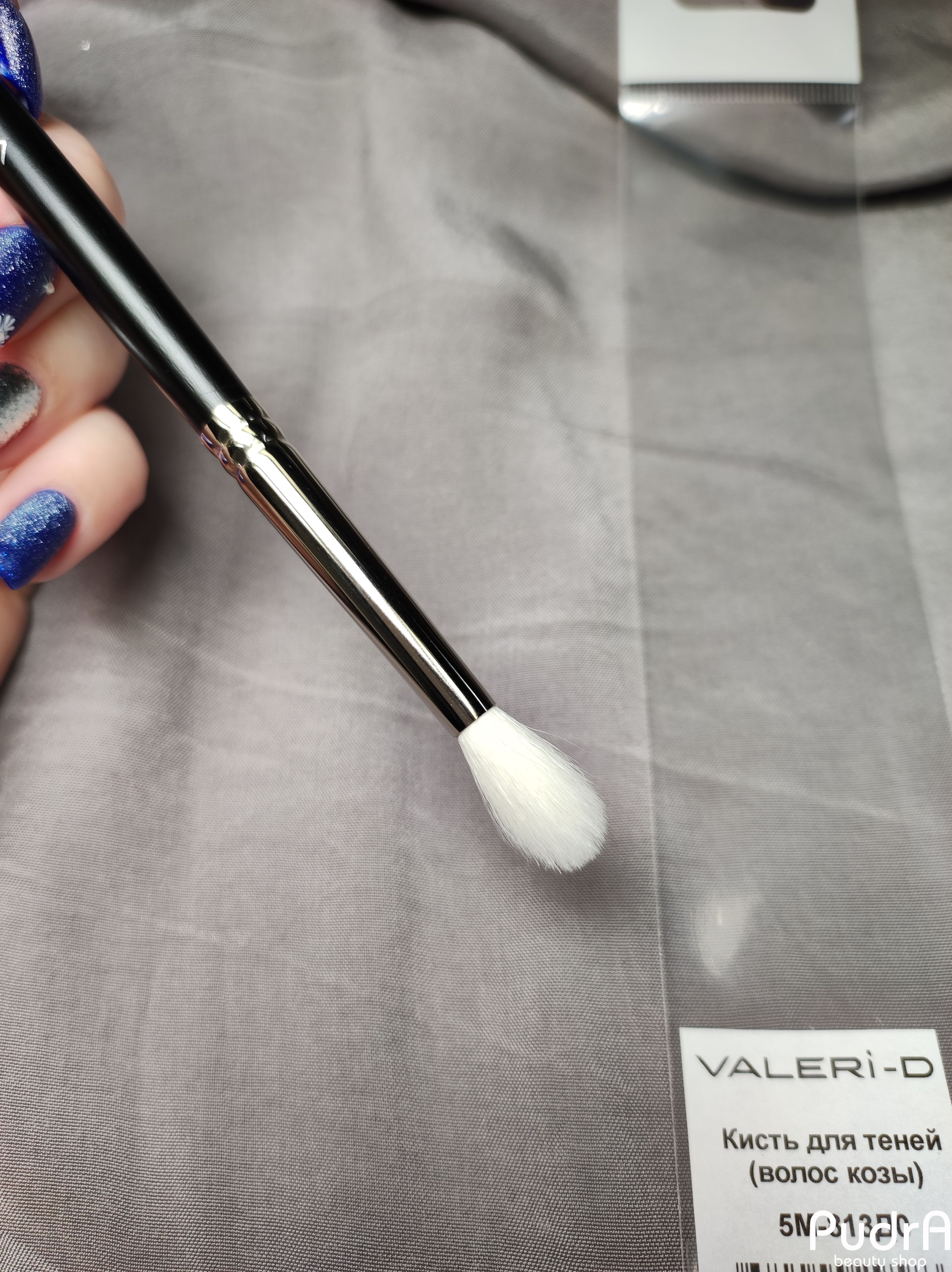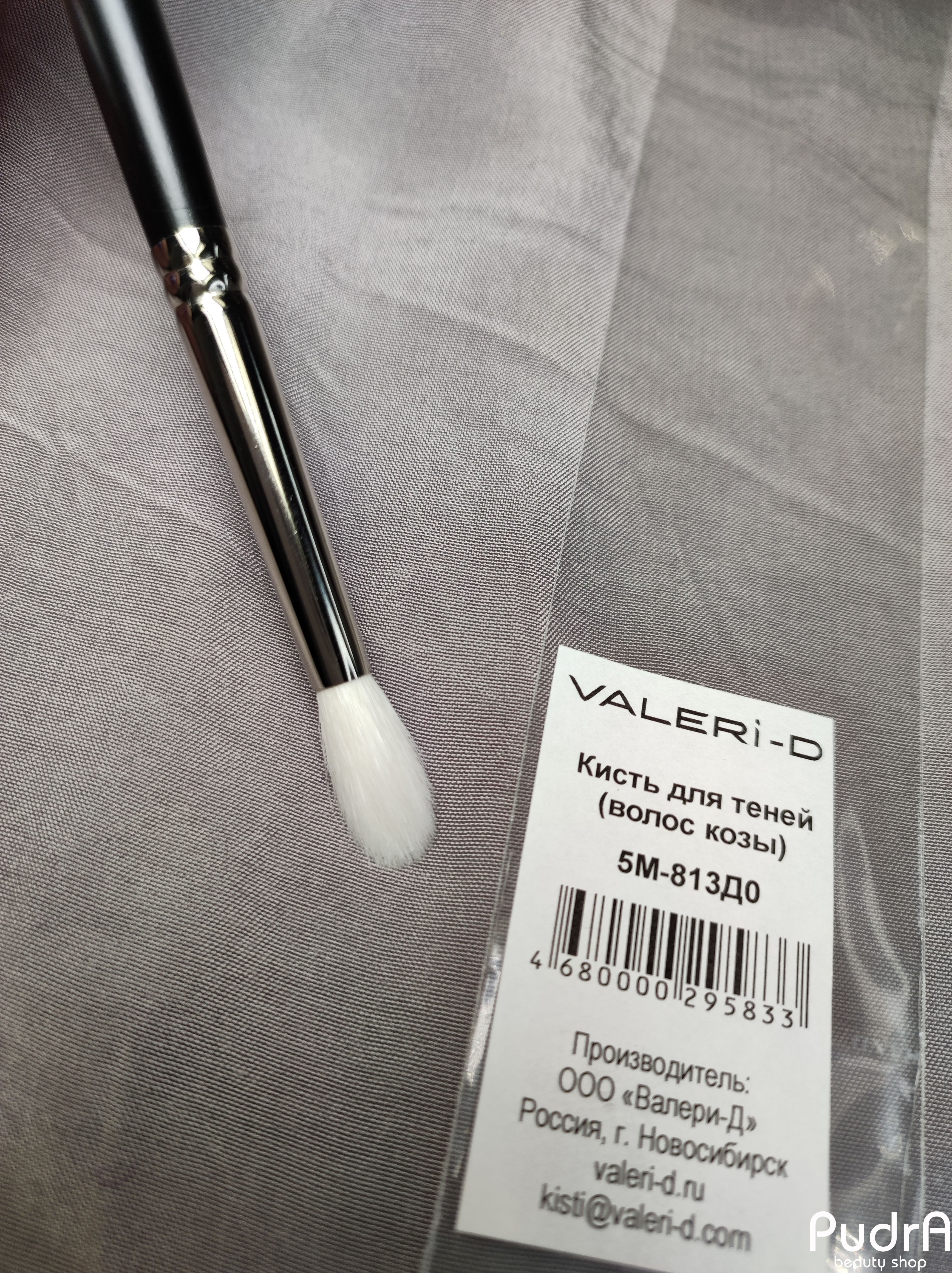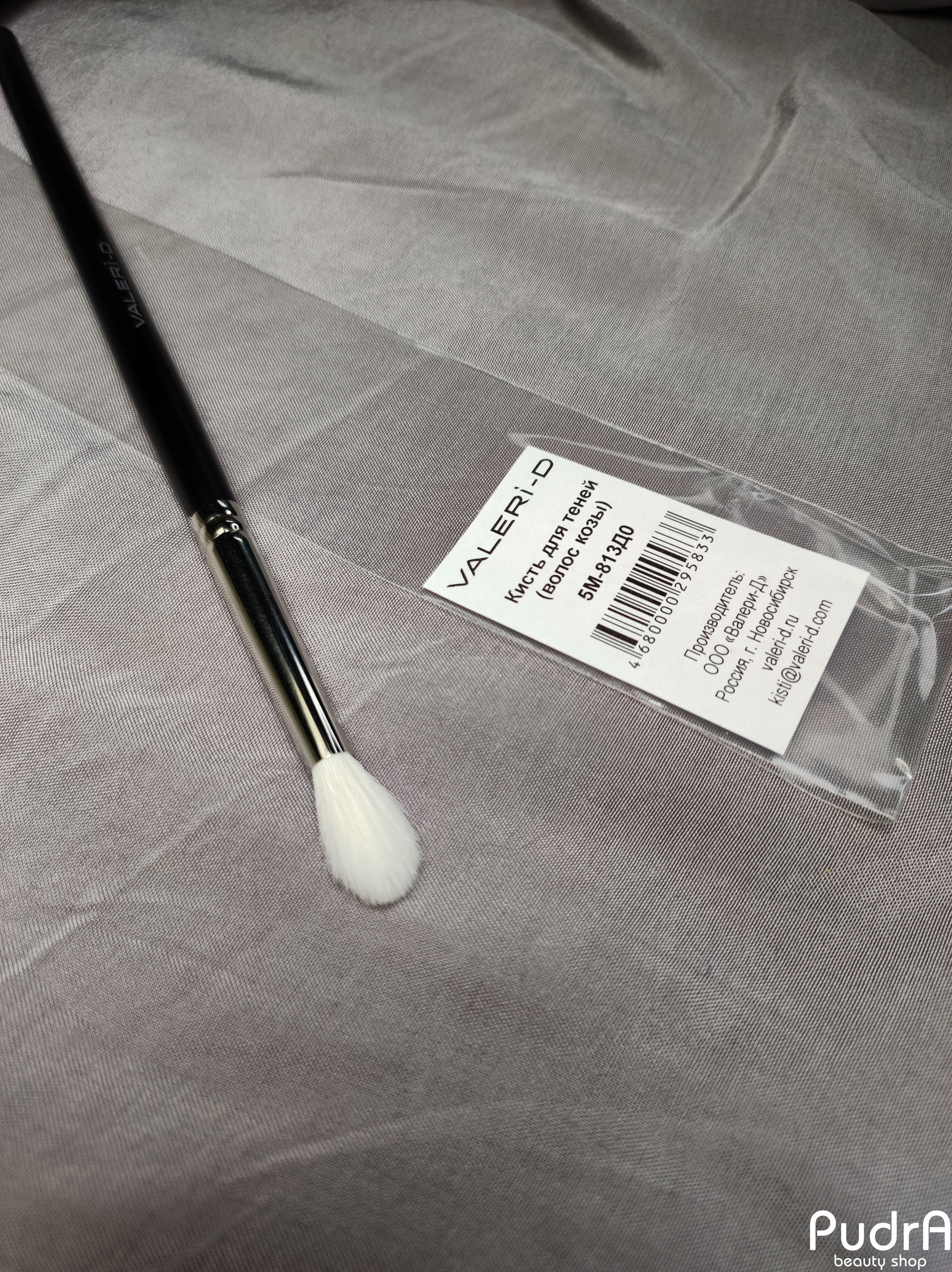 Кисть круглая для растушевки теней 5М 813Д0, из волоса козы, форма "метелочка" или "факел". Кисть из классической серии кистей Валери Д, выполнена на чёрной ручке, маркирована логотипом VALERI D, артикулом и названием волоса.